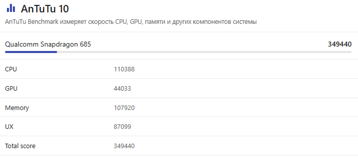 В тесте AnTuTu 10 процессор Snapdragon 685 набирает около 350 000 баллов — средний показатель.