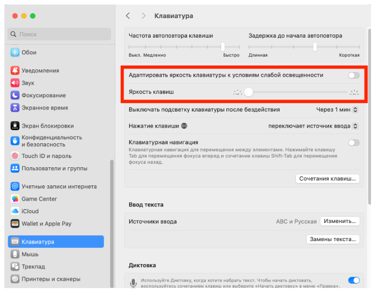 - Здесь можете настроить автоматическое отключение подсветки при бездействии и включить или отключить опцию «Адаптировать яркость клавиатуры в условиях слабой освещённости», если MacBook оснащён датчиком освещённости.