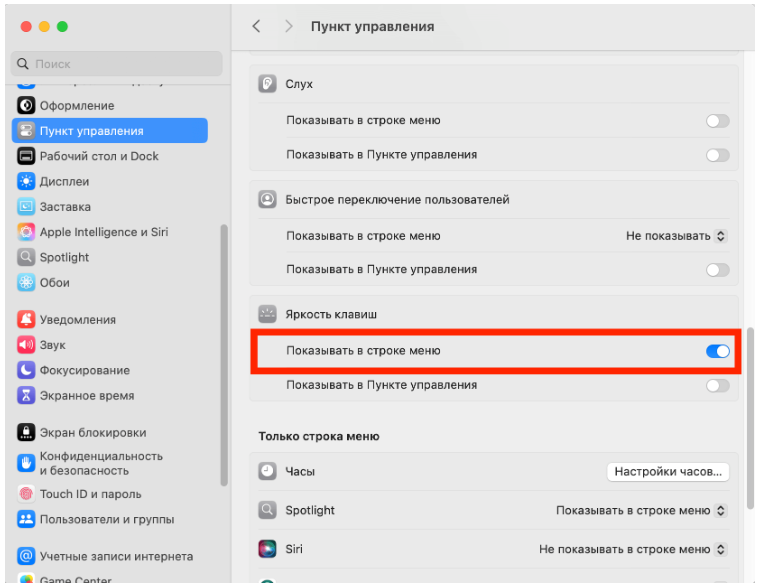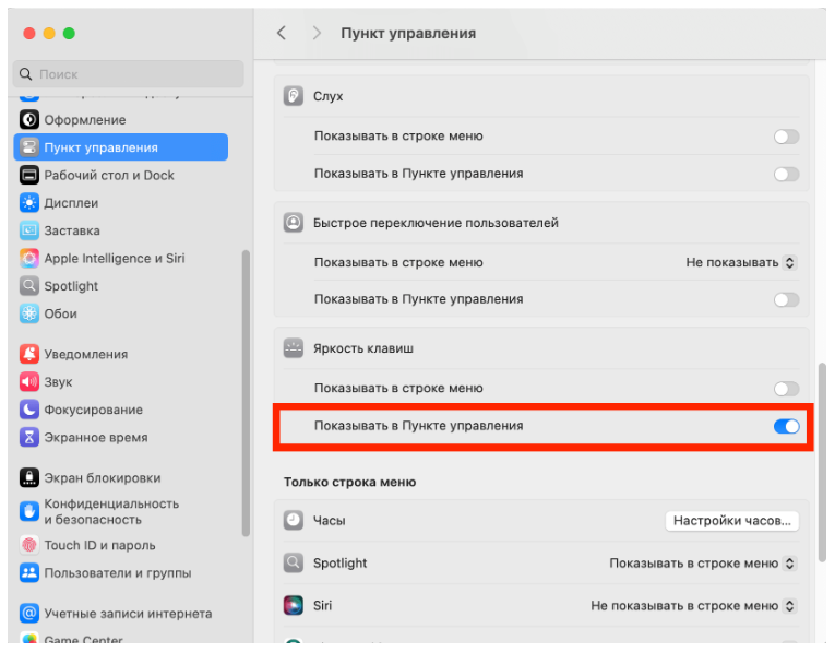 - Активируйте переключатели «Показывать в строке меню» и/или «Показывать в Пункте управления».